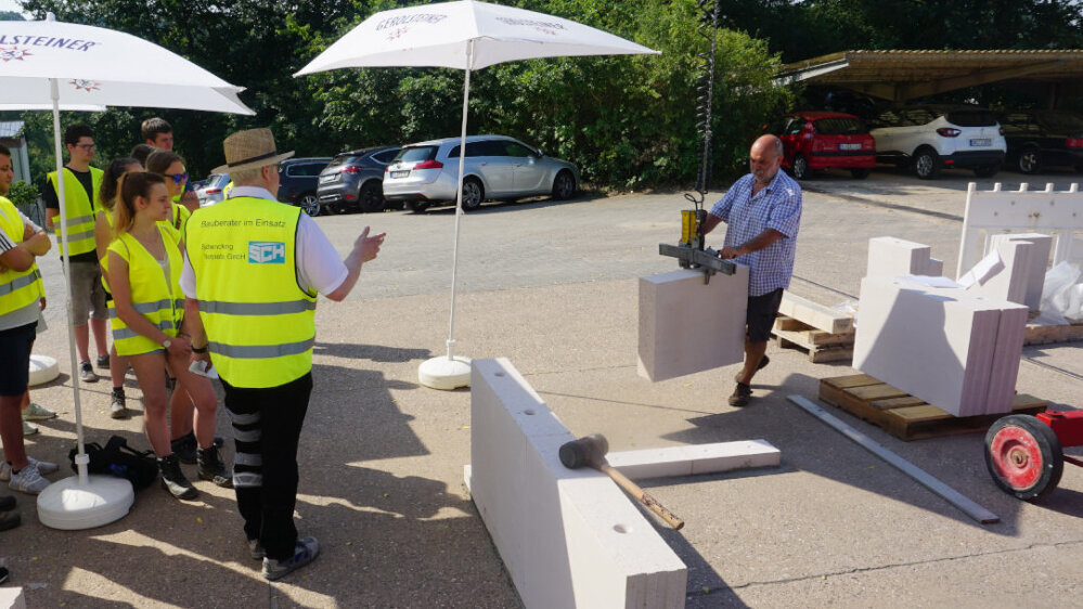 Übrigens: In Abstimmung mit dem entsprechenden Kalksandsteinwerk ist auch eine kleine Demonstration zur Verarbeitung von Kalksandsteinen möglich.