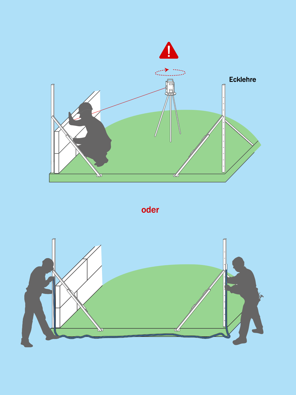 Der Zeitaufwand für das Herstellen und Einrichten der Ecklehren macht sich später beim Mauern mehrfach bezahlt. Die Lehren dienen als Schichtmaßlatte, Schnurhalter und als Dauerlot. Dies ist nicht nur für den Einsatz von Mörtelschlitten vorteilhaft.