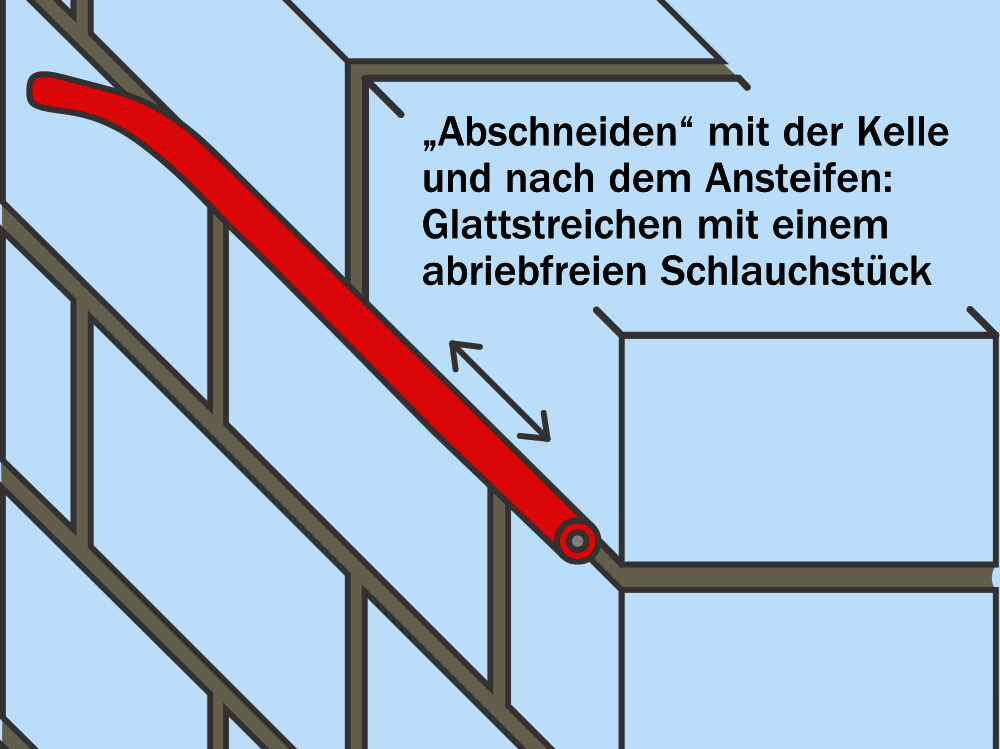 Die Form der Mörtelfuge darf den Abfluss von Niederschlagswasser nicht behindern. Dazu müssen die Oberseiten der Lagerflächen von KS-Verblendern immer vollständig mit Mörtel bedeckt sein.