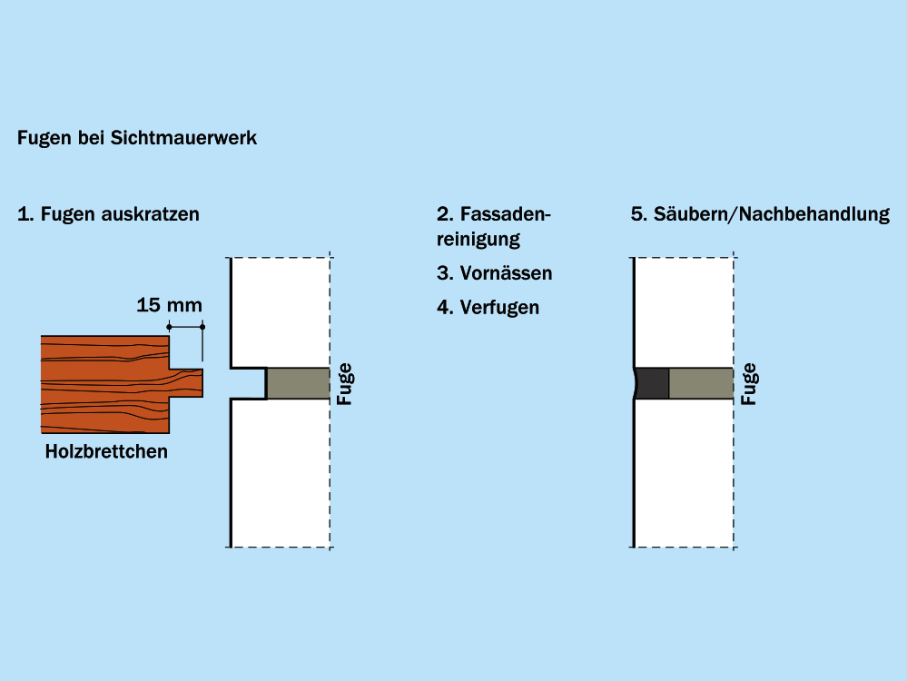 Bei der nachträglichen Verfugung ist die Fuge entsprechend DIN EN 1996-2 mindestens 1,5 cm tief und flankensauber beim Aufmauern auszukratzen. Steindicken < 10,5 cm sind direkt mit dem Mauermörtel (in eigenem Saft) zu verfugen.