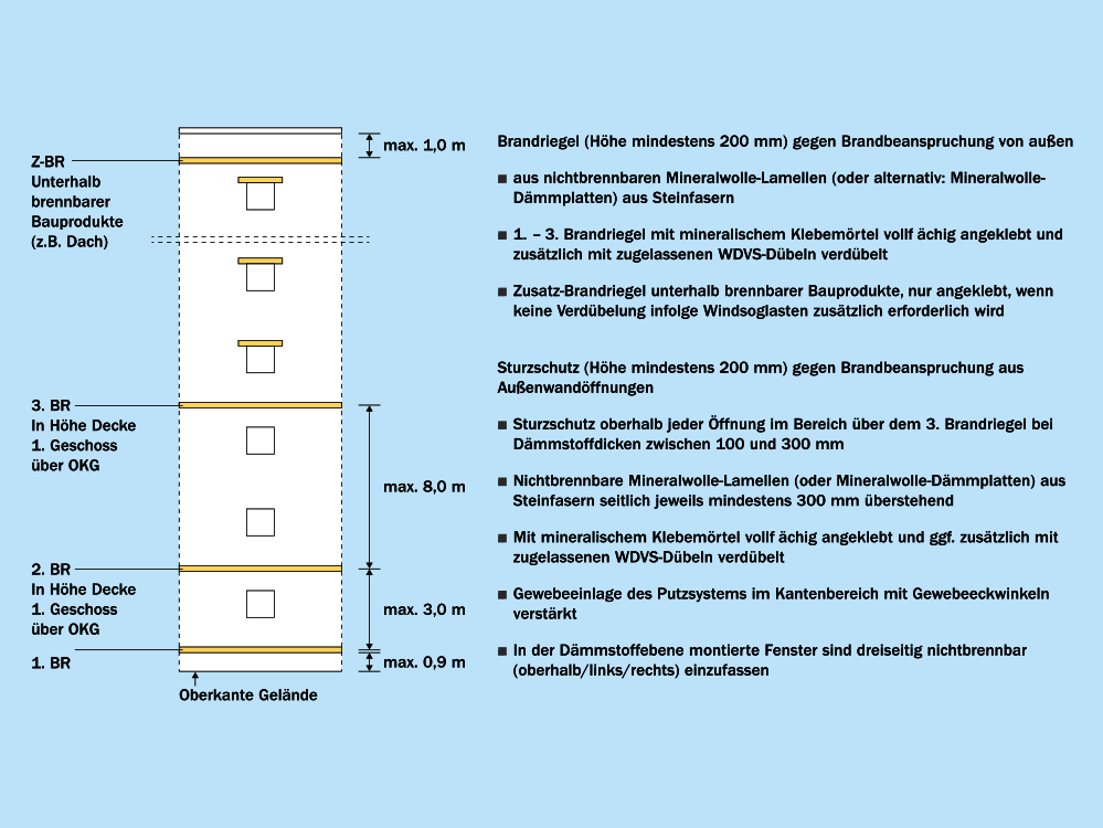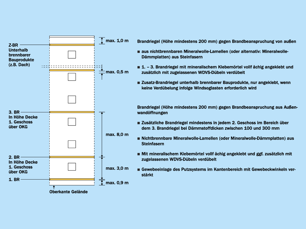 Als ergänzende konstruktive Anforderung zur Verhinderung einer Brandausbreitung sind nach den Regelungen der Muster-Verwaltungsvorschrift Technische Baubestimmungen in jedem zweiten Geschoss horizontale Brandsperren im Hinterlüftungsraum zwischen dem tragenden Untergrund und der Bekleidung anzuordnen. Bei üblicherweise außenliegender Wärmedämmung genügt der Einbau zwischen den Dämmplatten und der Bekleidung, wenn der Dämmstoff im Brandfall formstabil ist und einen Schmelzpunkt von mehr als 1.000 °C aufweist.