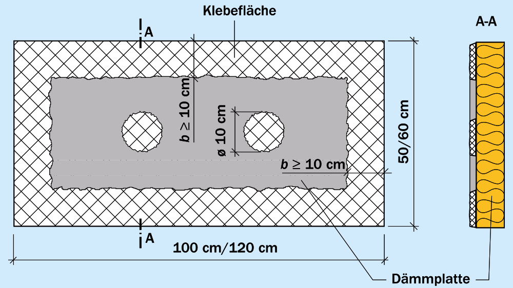 Bei ausreichend tragfähigem Untergrund – wie KS-Mauerwerk – können die Dämmplatten auch mit (mineralischen) Bauklebern vorzugsweise im Wulst-Punkt-Verfahren fixiert werden. Die Querzugfestigkeit muss in diesem Fall mindestens 1 kPa betragen.