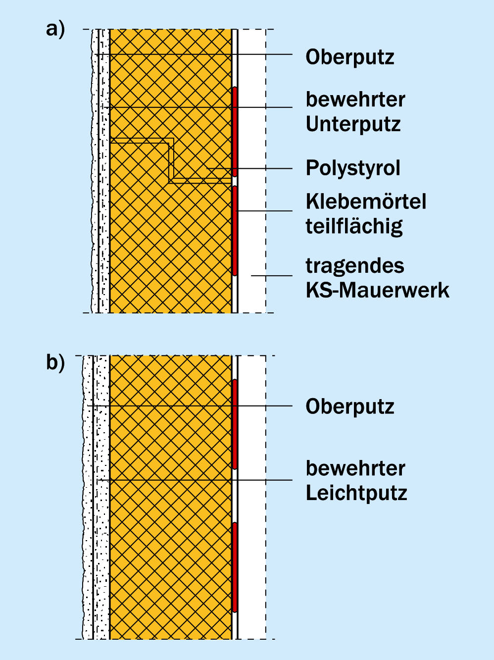 Wie bereits erwähnt, kann aufgrund der Qualität des KS-Mauerwerks die Verwendung von rein verklebten WDVS mit EPS-Dämmplatten oder Mineralwolle-Lamellen empfohlen werden.