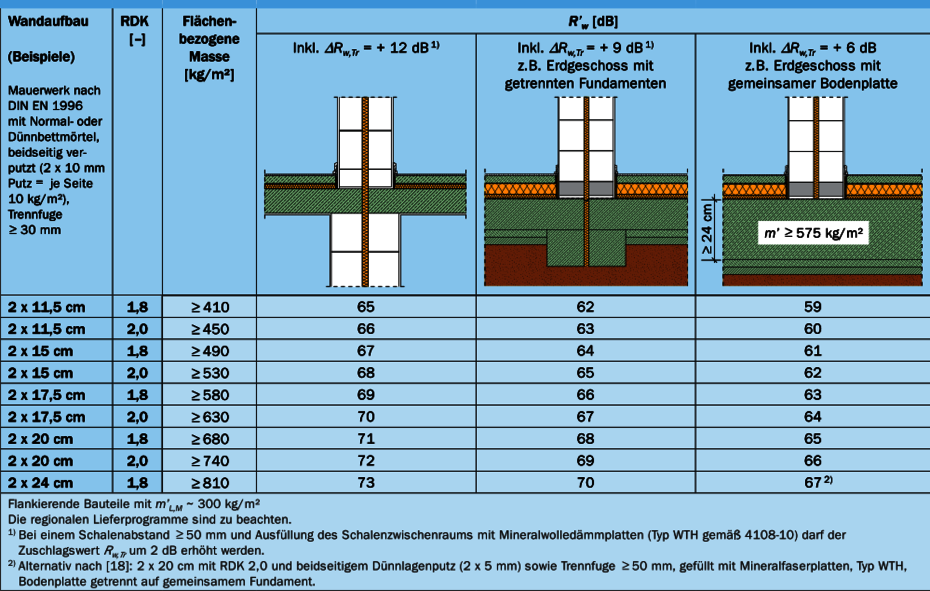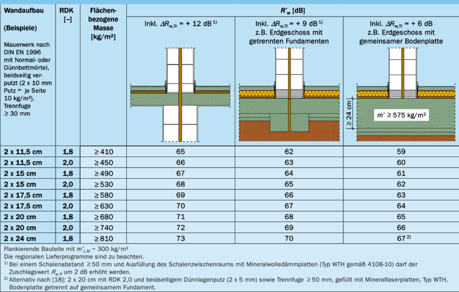 Dieser Dimensionierung liegt ein Schalenabstand von mindestens 30 mm zugrunde. Falls der Schalenabstand mindestens 50 mm beträgt und der Fugenhohlraum mit Mineralwolledämmplatten nach DIN EN 13162, Anwendungskurzzeichen WTH nach DIN 4108-10 ausgefüllt wird, können die Zuschlagswerte ∆Rw,Tr in denjenigen Situationen um 2 dB erhöht werden, in denen die Schallübertragung über Fundament und Bodenplatte keine signifikante Rolle spielt.