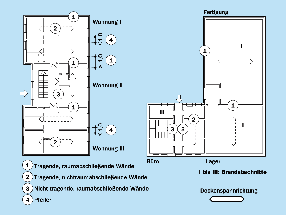Im Sinne des Baurechts und auch nach DIN EN 1996-1-2 werden die in einem Bauwerk vorhandenen Wände brandschutztechnisch in verschiedene Arten eingeteilt. Die Unterscheidung für tragende Wände erfolgt in raumabschließend und nichtraumabschließend: