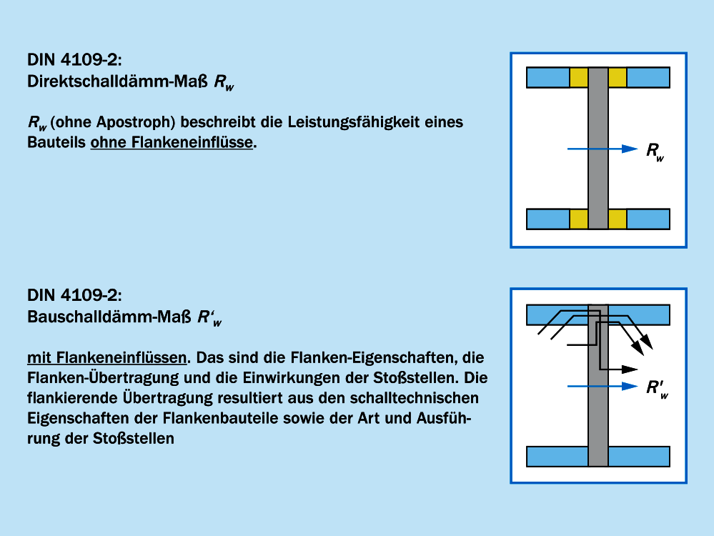 Die Direktdämmung Rw (= Laborwert) verschiedener Wohnungstrennwände bzw. Trenndecken wird durch den Einfluss der flankierenden Übertragung gemindert und ergibt im Endergebnis eine niedrigere resultierende Schalldämmung R’w (= Wert, der die gesamte Übertragungssituation inklusive Flanken charakterisiert).