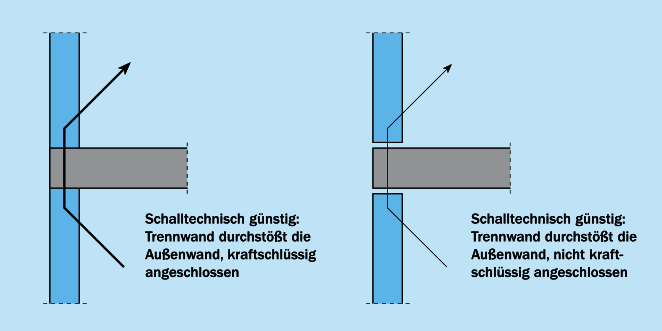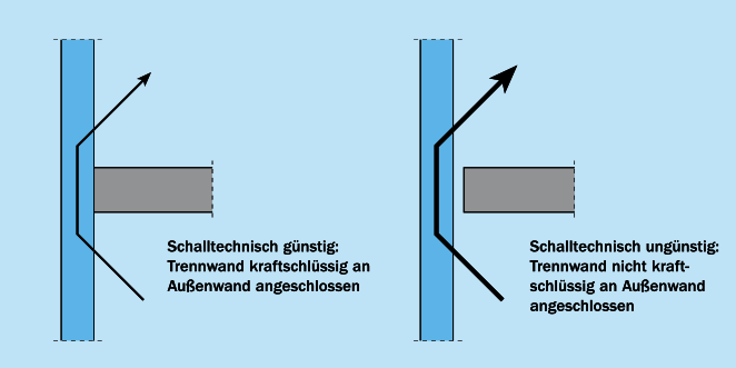 - Bei horizontaler Übertragung über die Wohnungstrennwand hinweg zusätzlich dafür sorgen, dass die Stoßstelle in der vorgegebenen Bauteilkombination (schwere Wohnungstrennwand, flankierende Außen- oder Innenwand) die maximal mögliche Stoßstellendämmung auch tatsächlich erreicht. Dies setzt eine schalltechnisch biegesteife Verbindung zwischen den Bauteilen voraus.