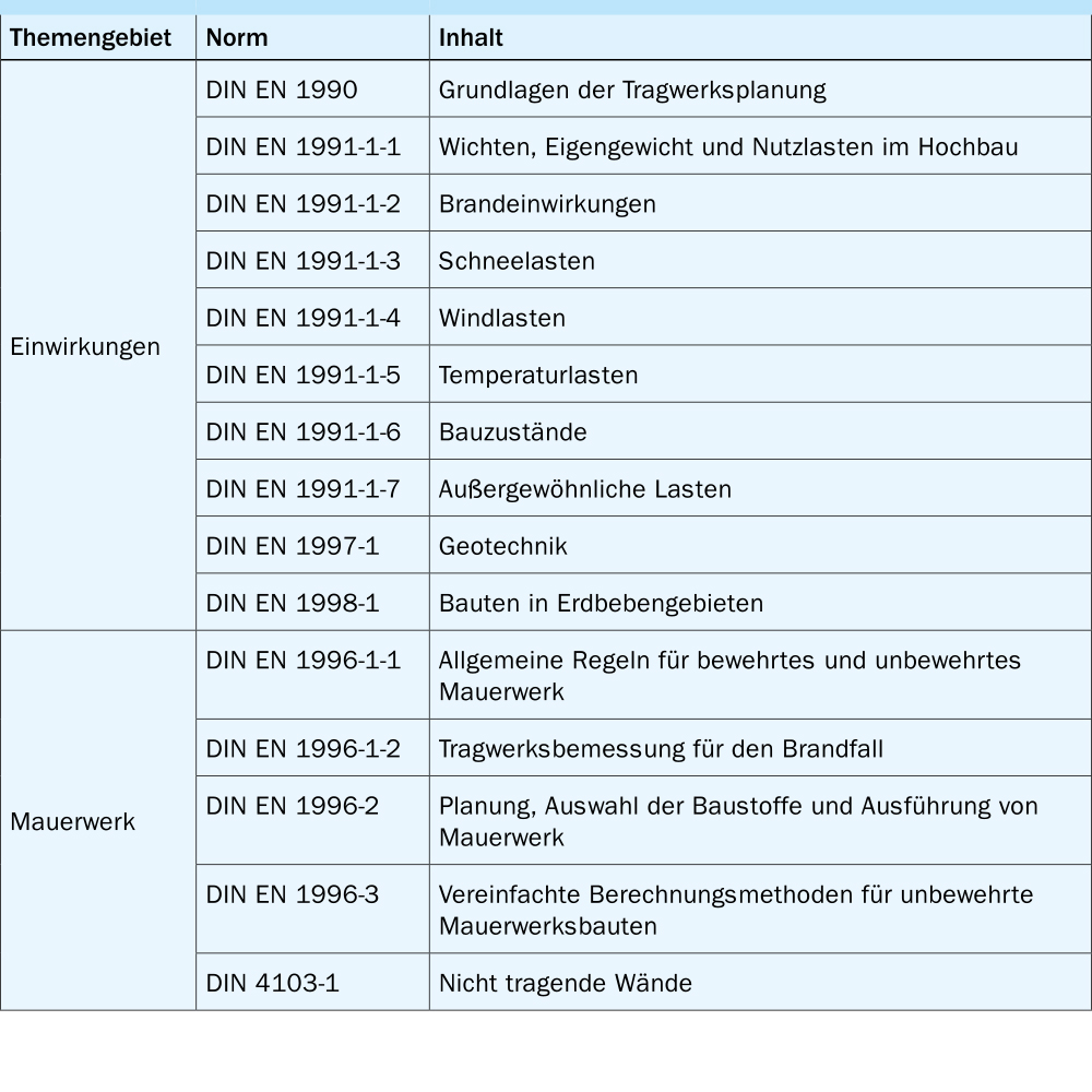 Im Zuge der Erarbeitung der Eurocodes (EN) erfolgte auch eine Überarbeitung der Baustoff übergreifenden Einwirkungsnormen. Die entsprechenden Regelungen, z.B. zur Berechnung von Wind- und Nutzlasten, sind ebenfalls am 1. Juli 2012 bauaufsichtlich eingeführt worden.