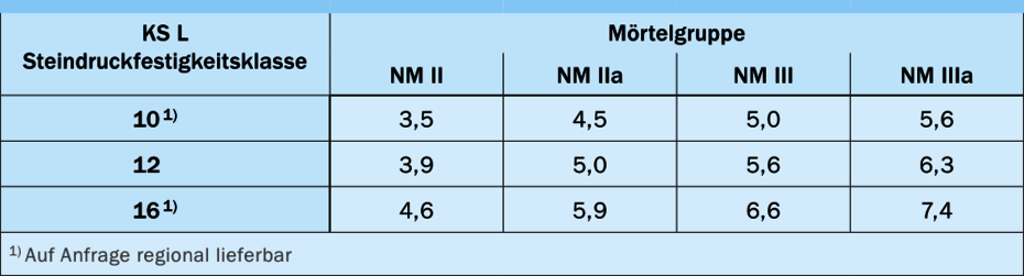 Die tabellierten Werte können auch im genaueren Berechnungsverfahren nach DIN EN 1996-1-1/NA angewendet werden. Diese entsprechen der im genaueren Berechnungsverfahren angegebenen Ermittlung der charakteristischen Druckfestigkeit von Mauerwerk mit Hilfe der dort angeführten Gleichungen.