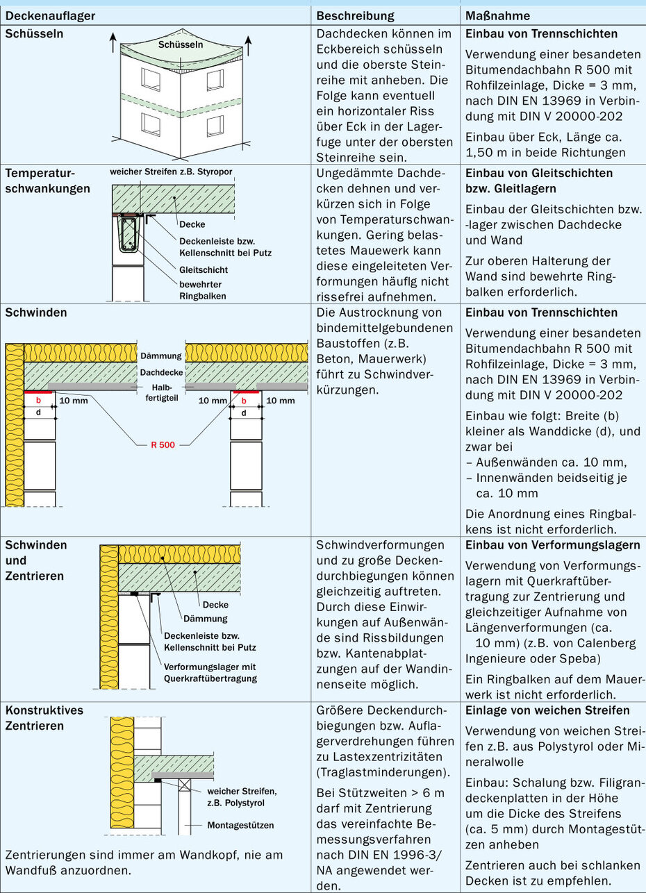 Unterschiedliche Verformungen zwischen tragenden Wänden und der Dachdecke können nach DIN 18530:1987-03 abgeschätzt werden. Ist danach mit Rissen zu rechnen, so ist die Dachdecke möglichst reibungsfrei auf den Wänden zu lagern. In diesem Fall ist ggf. auch ein Gleitlager mit Ringbalken unter der Dachdecke erforderlich.