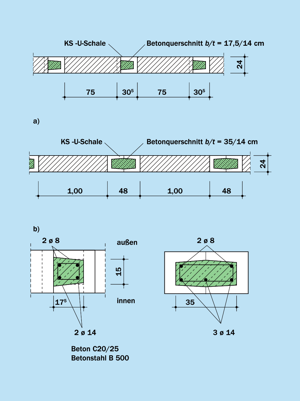 Die mögliche zweiachsige Tragwirkung durch Ansatz eines horizontalen Druckbogens kann über zusätzliche aussteifende Stahlbetonstützen unter Verwendung von KS -U-Schalen erreicht werden (siehe folgendene Bilder).