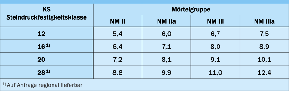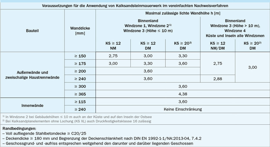 Selbst die vereinfachte Normtabelle für Kalksandsteinmauerwerk laut obenstehender ist aufgrund der zahlreichen Fußnoten und insbesondere wegen der Unterscheidung nach der Windbeanspruchung verhältnismäßig unübersichtlich. Es ist daher im Hinblick auf die praktische Anwendung sinnvoll, diese Tabelle noch weiter zu vereinfachen und nur die tatsächlich benötigten Parameter in direkter Abhängigkeit der Windzonen darzustellen. Die maximal zulässigen lichten Wandhöhen für Kalksandsteinmauerwerk, für die ein vereinfachter Nachweis ausreichend ist, sind nachfolgend in Abhängigkeit der betreffenden Windzone und der Stein-Mörtel-Kombination übersichtlich zusammengestellt. Hierbei ist berücksichtigt, dass Festigkeitsklassen ≥ 20 nur von Vollsteinen erreicht werden.