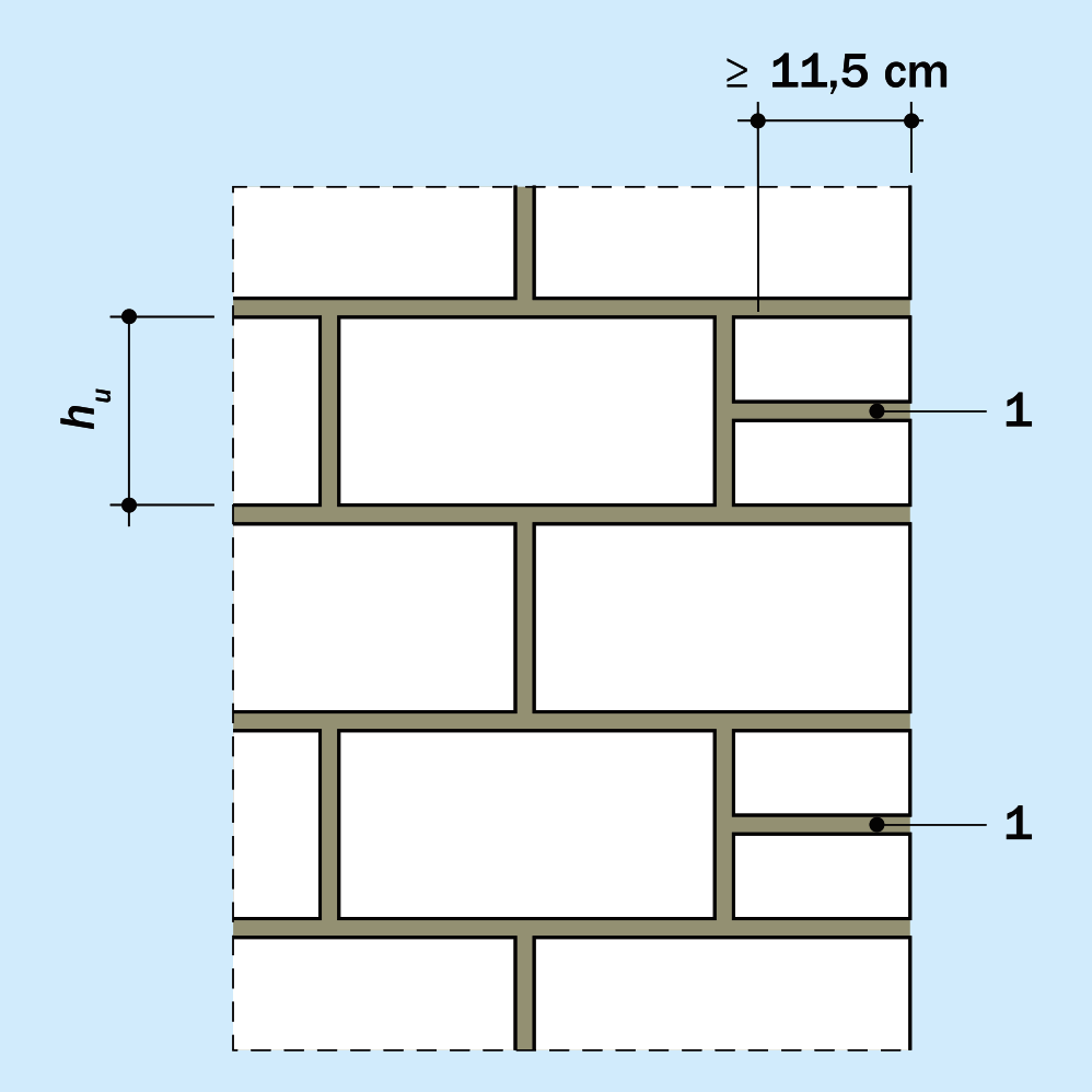 Die Forderung nach der Einhaltung des Überbindemaßes wird durch die Ausführung des Mauerwerks im Verband gewährleistet, wenn die Stoß- und Längsfugen übereinander liegender Schichten mindestens mit dem Überbindemaß lol ≥ 0,4 · hu bzw. lol ≥ 45 mm (der größere Wert ist maßgebend) angeordnet werden.