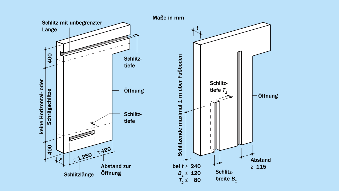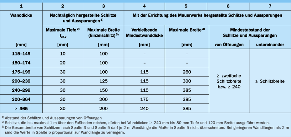 Vertikale Schlitze und Aussparungen sind auch dann ohne Nachweis zulässig, wenn die Querschnittsschwächung, bezogen auf 1 m Wandlänge, weniger als 6% beträgt und die Wand nicht drei- oder vierseitig gehalten nachgewiesen wird. Hierbei müssen eine Restwanddicke nach Spalte 4 und ein Mindestabstand nach Spalte 6 der folgenden Tabelle eingehalten werden. Die Festlegungen gelten nur für tragende Wände. Schlitze und Aussparungen in Schornsteinwangen sind unzulässig. Längere horizontale Schlitze am Wandkopf sollten zur Vermeidung von Rissbildung und Abplatzungen nicht unmittelbar unter dem Deckenauflager angeordnet werden, dürfen aber nur 40 cm unterhalb Wandkopf und 40 cm oberhalb Wandfuß angeordnet werden. Alle übrigen Schlitze und Aussparungen sind bei der Bemessung des Mauerwerks zu berücksichtigen.