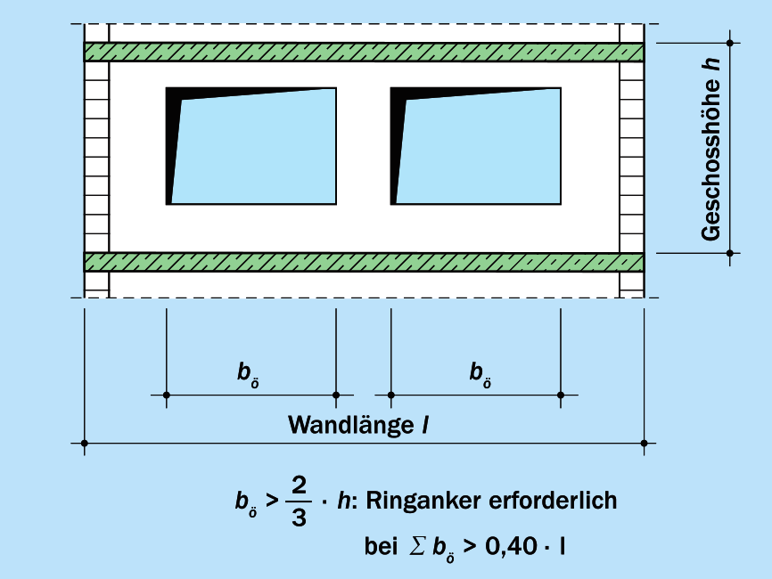 Nach DIN 1053-1 mussten alle Außenwände und diejenigen Innenwände, die der Abtragung der Aussteifungskräfte dienen, Ringanker erhalten, wenn nachstehende Randbedingungen vorliegen. Vergleichbare Regelungen sind im Eurocode nicht enthalten. Es empfiehlt sich jedoch, die bewährten Regeln bei der Planung zu berücksichtigen.