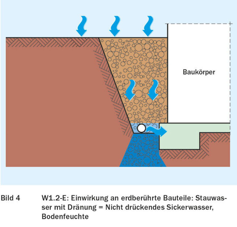 Die geringste Wassereinwirkungsklasse W1.1-E aus Bodenfeuchte (an Bodenplatten und erdberührten Wänden) und nicht drückendes Sickerwasser (an erdberührten Wänden) liegt nach normativer Zuordnung nur vor, wenn das Gelände über dem Bemessungswasserstand liegt und der Baugrund – und auch das Verfüllmaterial des Arbeitsraums – aus stark durchlässigem Boden besteht.