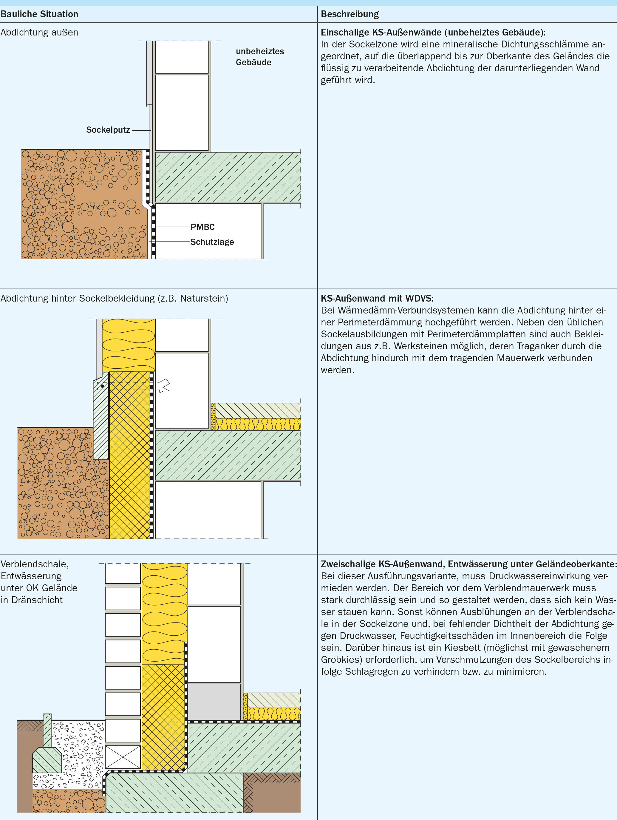Bei der Abdichtung erdberührter Bauteile können entweder kunststoffmodifizierte Bitumendickbeschichtungen (PMBC/KMB) oder bahnenförmige Abdichtungen zum Einsatz kommen. Kalksandstein-Mauerwerk, insbesondere solches aus Plansteinen und Planelementen, ist als Untergrund für PMBC sehr gut geeignet. Unterputze und egalisierende Kratzspachtelungen sind in der Regel nicht erforderlich.