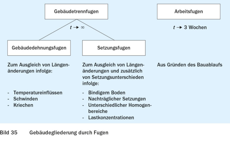 Die Gliederung komplexer Gebäudegrundrisse in einzelne Baukörper durch Gebäudetrennfugen verringert die Zwangsspannungen z.B. aus Kriechen, Schwinden und Temperatureinflüssen. Je nach vorhandener Gründung und Gebäudegeometrie sind Setzungsfugen zu planen. Arbeitsfugen in Stahlbetondecken werden aus technologischen Gründen gewählt, lassen sich aber auch vom Planer festlege und sind dann in den Bauunterlagen, insbesondere in der Ausschreibung, aufzuführen. Sind weder Arbeitsfugen noch Schwindgassen geplant und ausgeschrieben, werden in der Praxis sehr große Deckenbereiche in einem Zuge hergestellt, womit das Rissrisiko in den angekoppelten Mauerwerkswänden erheblich steigt.