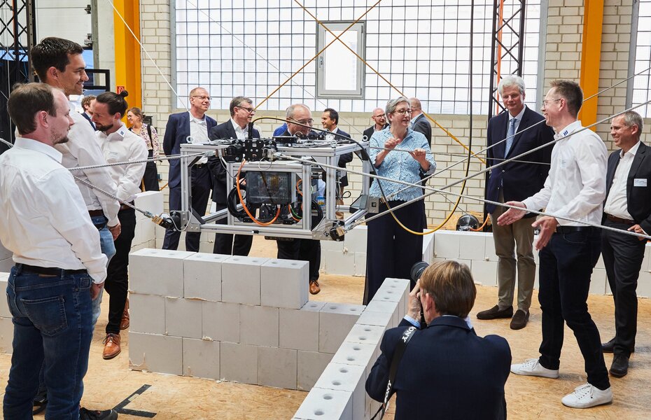 Bundesbauministerin Klara Geywitz lobt Entwicklung der Seilroboter-Technologie für den Mauerwerksbau
