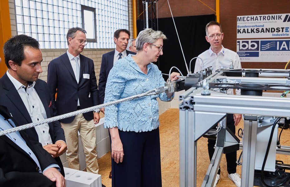 Bundesbauministerin Klara Geywitz hat sich auf ihrer Sommerreise am 29. August 2022 an der Universität Duisburg-Essen (UDE) anhand der Entwicklung eines Seilroboters für das Mauerwerk einen ersten Eindruck verschafft, welchen Beitrag die Kalksandsteinindustrie zur Automatisierung und Digitalisierung der Baubranche mit praxisbezogener Forschungsarbeit leistet. Hinsichtlich der Beschleunigung der Digitalisierung des Bauwesens und einer gezielten Bauforschungsförderung fordern sowohl die Forschenden als auch der Bundesverband Kalksandsteinindustrie e.V. (BV KSI) mehr Unterstützung seitens der Politik.