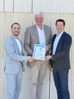 Bild 1: „Das Kalksandstein-Nachhaltigkeitsgütesiegel ist ein klarer Ansporn für unsere Produktion“, ist sich Jan Dietrich Radmacher (m.), geschäftsführender Gesellschafter des Kalksandsteinwerks Wendeburg bei Braunschweig sicher, „denn es zeigt uns transparent auf, wo wir stehen und wo wir mit Blick auf die klimaneutrale Kalksandsteinherstellung hinmüssen.“ Bei der Übergabe des Siegels erläuterte Zakaria Istanbuly (l.), stellvertretender Leiter Forschung und Technologie beim Bundesverband Kalksandsteinindustrie e.V. die Ergebnisse und Optimierungspotenziale des Werks. Geschäftsführer Roland Meißner (r.) freut sich, dass sich schon kurz nach dem Start bereits die Hälfte aller deutschen Kalksandsteinwerke um das Gütesiegel beworben hat..