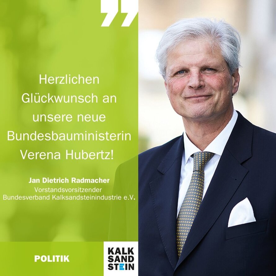 Im Namen der gesamten deutschen Kalksandsteinindustrie gratuliere ich Ihnen sehr herzlich zur Ernennung als Bundesbauministerin.