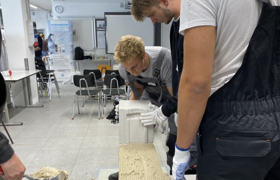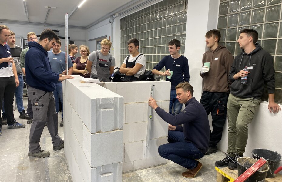 Danach fing der praktische Teil es Tages an: Innerhalb von zwei Stunden galt es, eine Wandkonstruktion mit den Maßen 1,80 x 1,00 m zu mauern. Dabei bildete eine 24 cm dicke Porenbetonwand die „Außenwand“ und eine 11.5 cm dicke Kalksandsteinwand die „Innenwand" mit Stumpfanstoß. Herr Carikcioglu, Herr Spinner, Herr Warken und Frau Lennig standen bei Fragen mit Rat und Tat zur Seite.
