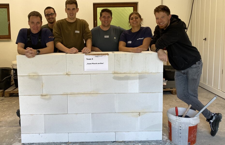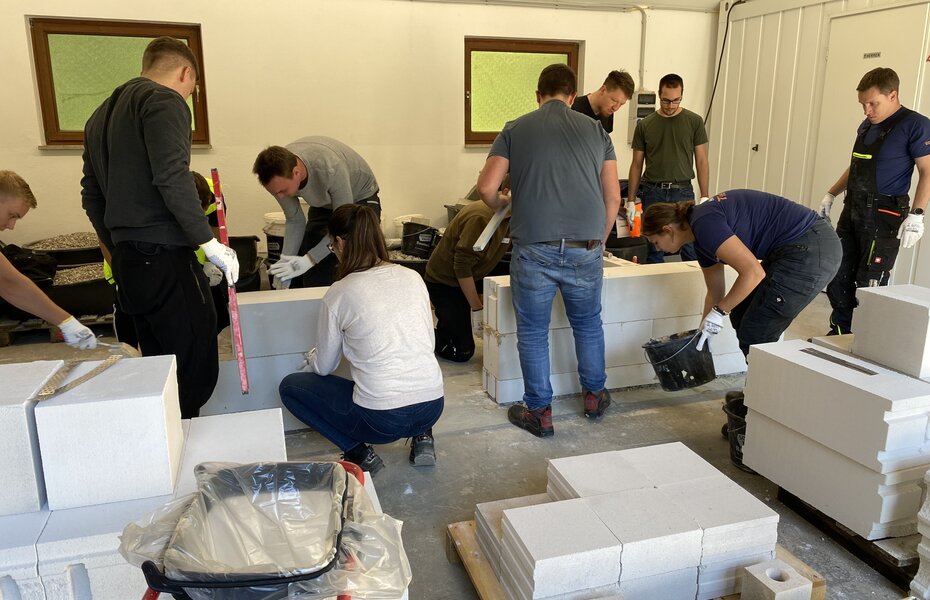 Auch wenn einige Studierenden bereits Erfahrung mit dem Mauerwerksbau hatten, kam es am Anfang noch zu kleinen Unsicherheiten im Umgang mit Plankellen für Kalksandstein und Porenbeton, davon war allerdings schon nach wenigen Minuten nichts mehr zu sehen. Bei den Teams wurde der Ehrgeiz geweckt, das beste und konstruktiv korrektes Mauerstück zu errichten.